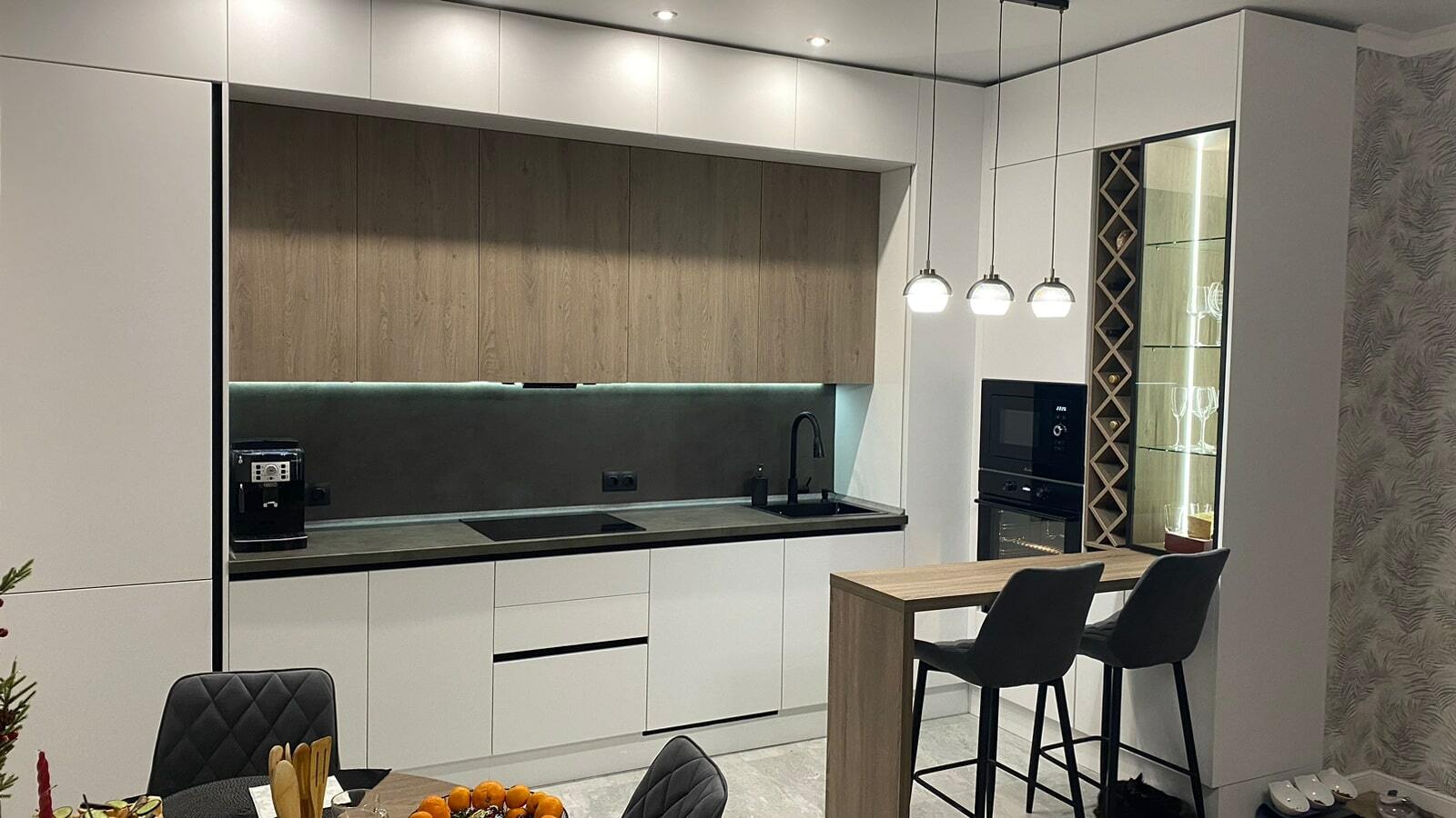 При расчёте кухни учитываются: размер, форма, материалы, цвет.